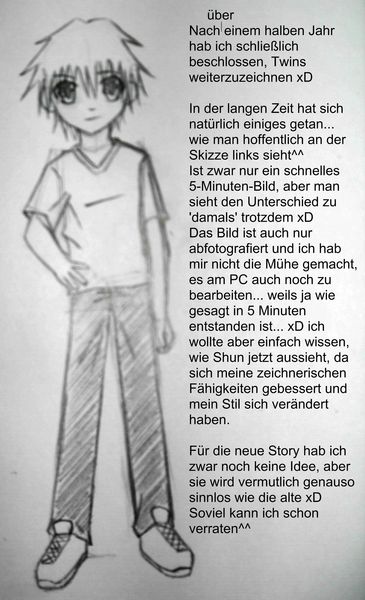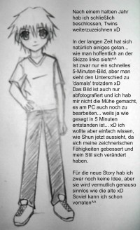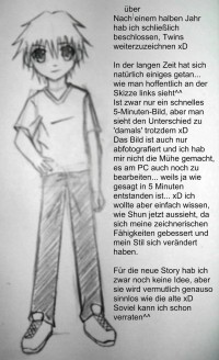 Mein erster Douji... 'ne Kurzgeschichte über die Zwillinge Shun und Kazumi, ich weiß nicht obs noch mehr geben wird. Kommt drauf an obs euch gefällt. Ich weiß, ich kann noch nicht gut zeichnen, deswegen hoffe ich auch vor allem auf konstruktive Kritik ;) - - - - - - - - - - - - - - - - - - - - - - - - - - - - - - - - - - - - - - ach und, auch wenn bei status abgebrochen steht, stimmt das nicht, sonst wäre ja jeder Douji hier abgebrochen ;) - - - - - - - - - - - - - - - - - - - - - - - - - - - - - - - - - - - - - - - - - - - - - - - - - - - - - - - - - - - - - - - - - - - - - - - - - - - - - - - - - - - - - - - - - - - - - - - - - - - - - - - - - - - - - - - - - - - - °°°°°° 19. April - die ersten 3 Seiten sind on! °°°°°° 20. April - 1 neue Seite! °°°°°° 22. April - 2 neue Seiten, 1 fehlt noch! °°°°°° 24. April - 3 neue Seiten, die letzte, ne Laberseite und ein Thanks-Bild^^
