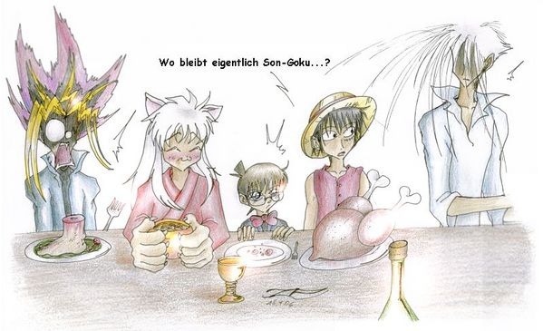 mein chara hat also sämtliche davon zu einem osteressen eingeladen; yugi aus yu-gi-oh, inu-yasha aus der gleichnamigen serie, conan aus...er...naja auch gleichnamigen serie XD, ruffy aus one-piece und son-goku aus dragonball/z/gt, der spurlos verschwunden ist - das jedenfalls glauben die anderen gäste...