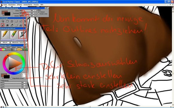 Die Pinselspitze wird sehr duenn eingestellt, die Deckkraft sehr hoch. Langsam werden die noch sichtbaren Outlines nachgezogen, es ist allerdings nicht noetig, dass diese schwarz gezeichnet werden, das ist jedem selbt ueberlassen."