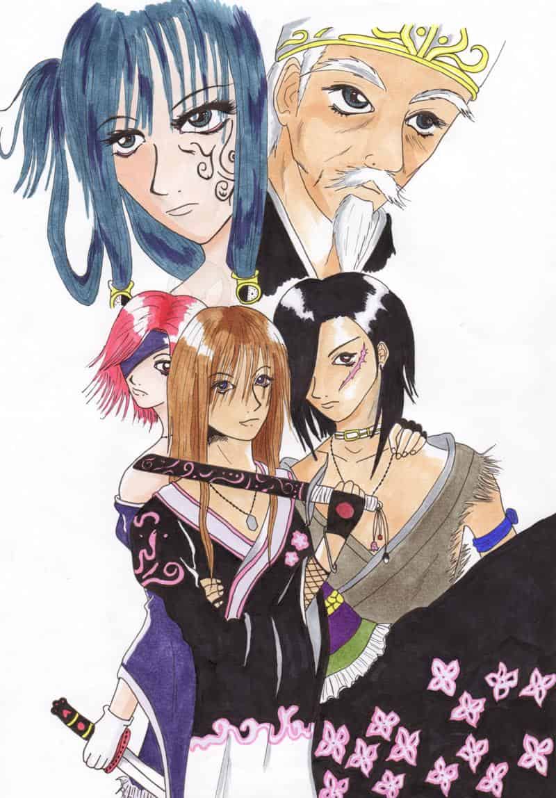 Cover of a Shônen-Ai Manga. Omoide, who holds his future in his arms x) next to his childhood friend and in the background the two rival rulers.