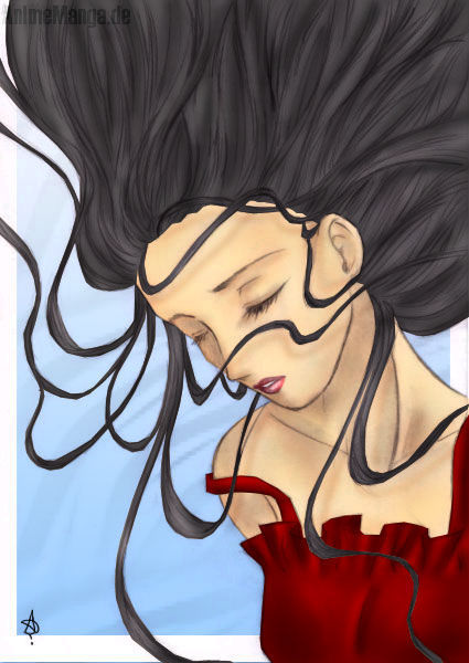 Ps. She should have black hair and net gray! u.u "" "and the skin is intentionally overexposed so that it looks like porcelain -> do you write it like that?.? !!!