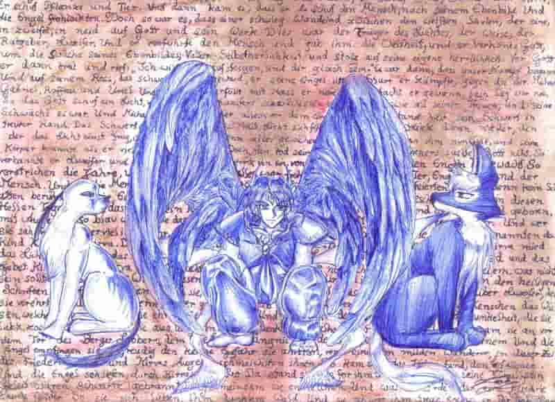 yes, it's me again and again just a school picture and again just a ballpoint pen pictureXD but I like it: P it shows metheu (you already know him from the picture "metheus ghost") and kiru and tera, (whom you only know if you jo heist: P appear in my haefft book comic) I didn't know what to start with the hg so I just wrote something about sevels story: P sorry for more I don't have time: P hope you like it, have to do a second one painting angels: P medium: a somewhat thicker paper, 8 inches x doesn't know anything (a little longer than normal din a 5), ballpoint pen, pastel chalk and ink (for writing) criticism: his feet are a little at the wrong angle, wings don't the same size uund..erm ... ka: P feel free to criticize somethingXD