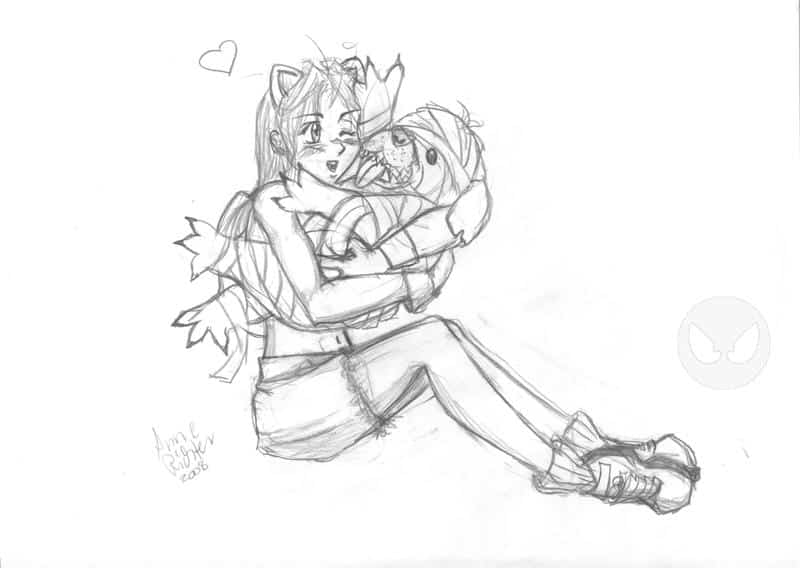 Eine schnelle Zeichnung meiner Kayuna aus Ragnarok, wie sie mit einem Verit knuddelt während mein Freund sie leecht. xD