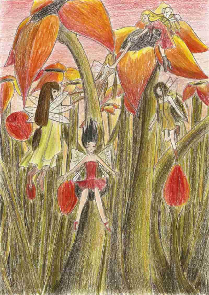 Ach ja, falls ihr euch fragen solltet, warum die Elfe in der Mitte Haare hat, die vom Kopof abstehen^^: Sie ruscht gerade den Stengel der Blume ab und die Haare wehen hinter ihr her.