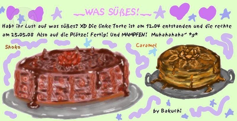 Die zwei Torten sprechen ja für sich, sind am PC entstanden, eher skizzenhaft, also keine große Mühe meinerseits, aber so in Verglecih fand ich das irgendwie ganz lustig, daher lad ich es hoch, freu mich über jedes Kommi, vllt bekommt ein oder andere auch ein Stück ^.~ Zwei Torten stehen ja zur Wahl *g* x))