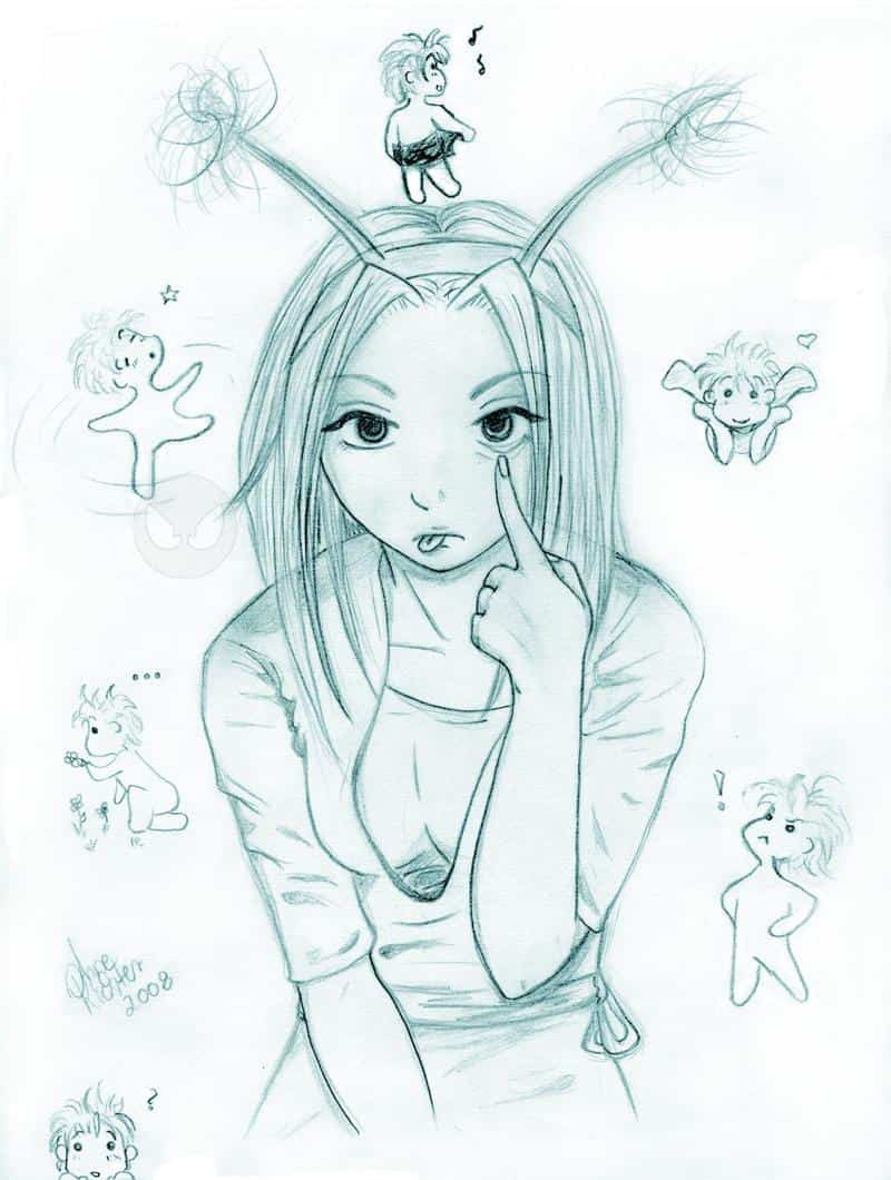Hier hatte ich den unbedingten Drang ein witziges Bild zu zeichnen. *lacht* Ich wollt so gern mal diese Pose probieren. ^^ Najaaa, irgendwie erinnert sie mich an Sakura aus Naruto, allerdings ist das Zufall, da ich keinen Bezug zu dieser Serie habe. ^^ Die Chibis sind nur als Lückenfüller gedacht. *grinsel*