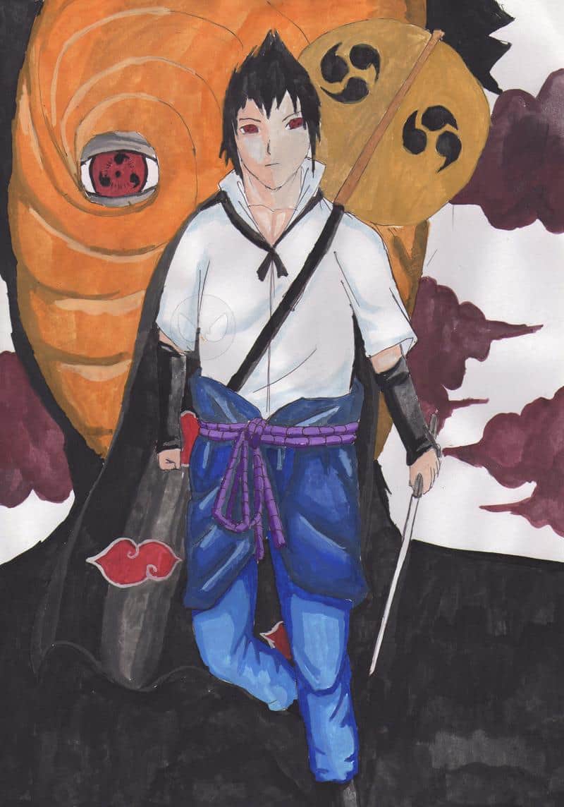 Njo, wieder mal ein Bild mit Wasserfarben. Suskes neue Sachen, außer der Mantel. Im Hintergrund Uchiha Madara.
