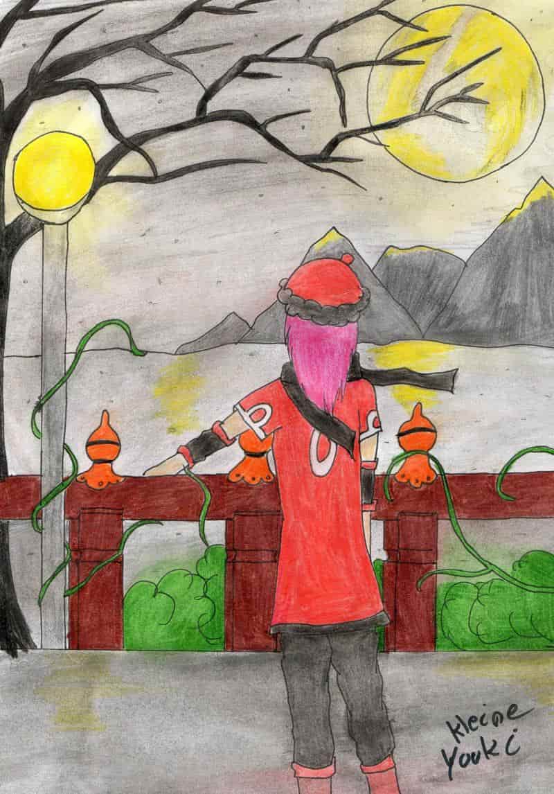 Es ist nacht und sakura steht auf einer brücke vor einer landschaft.
