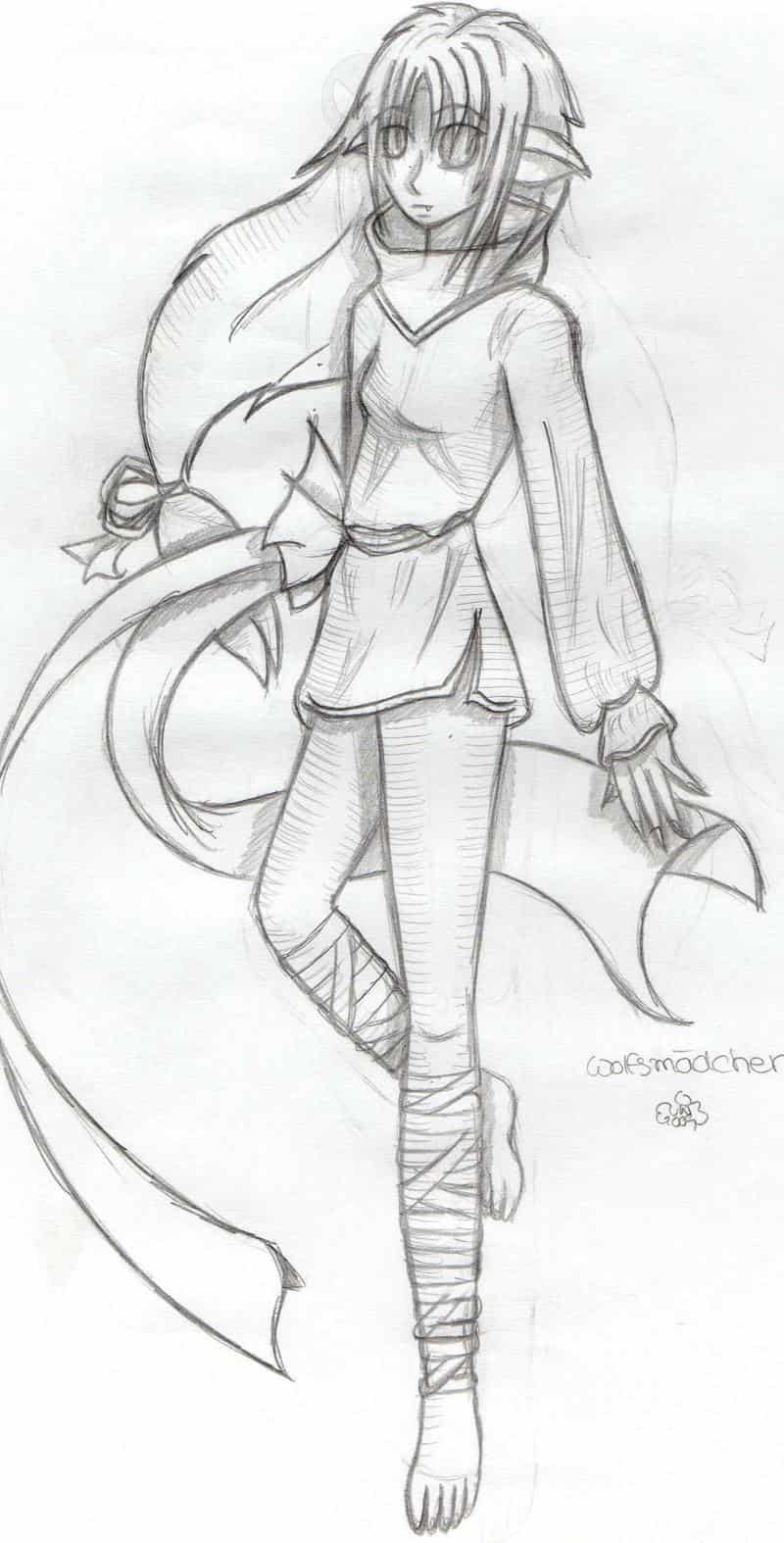 Hier hab ich mal ein bisschen abgezeichnet, aber hauptsächlich die Figur (Füße und die Hand). Das Outfit, außer den Bändern hab ich selbst entworfen. Naja, freue mich halt über Kommentare. LG, black-butterfly