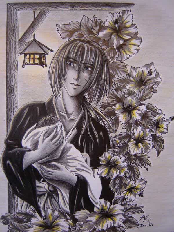 Jedenfalls inspirierte mich das Bild, wo Kenshin seinen neugeborenen Sohn hält zu diesem kleinen Bild. Eigentlich sollte sein Ausdruck freudig-nachdenklich sein. Naja, urteilt selbst, ob mir das gelungen ist. Happy bin ich dieses Mal wegen der Hände! Doch, doch, die mag ich^^. Und die Blüten waren eine HEIDENarbeit.