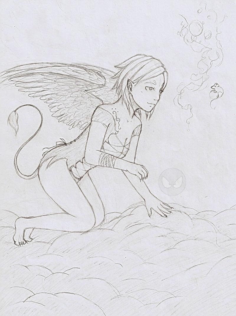 Geflügeltes Mädchen mit Appetit auf Mäuse