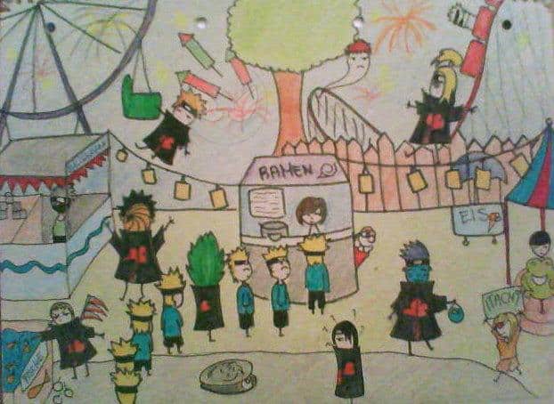 ist irgendwann entstanden als ich und eine freundin uns darüber unterhalten haben, wie chaotisch ein jahrmarkt wohl in konoah ablaufen würde. . ^^