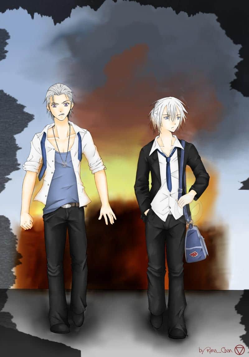 Eigentlich fand ich die Idee ganz lustig, Hotaru und Hidan zu zeichnen, die gerade nach Hause gehen, hinter ihnen die brennende Schule. Bei der Umsetzung merkte ich dann, dass es doch keine so gute Idee war. Vor allem beim Hintergrund. Grottig!