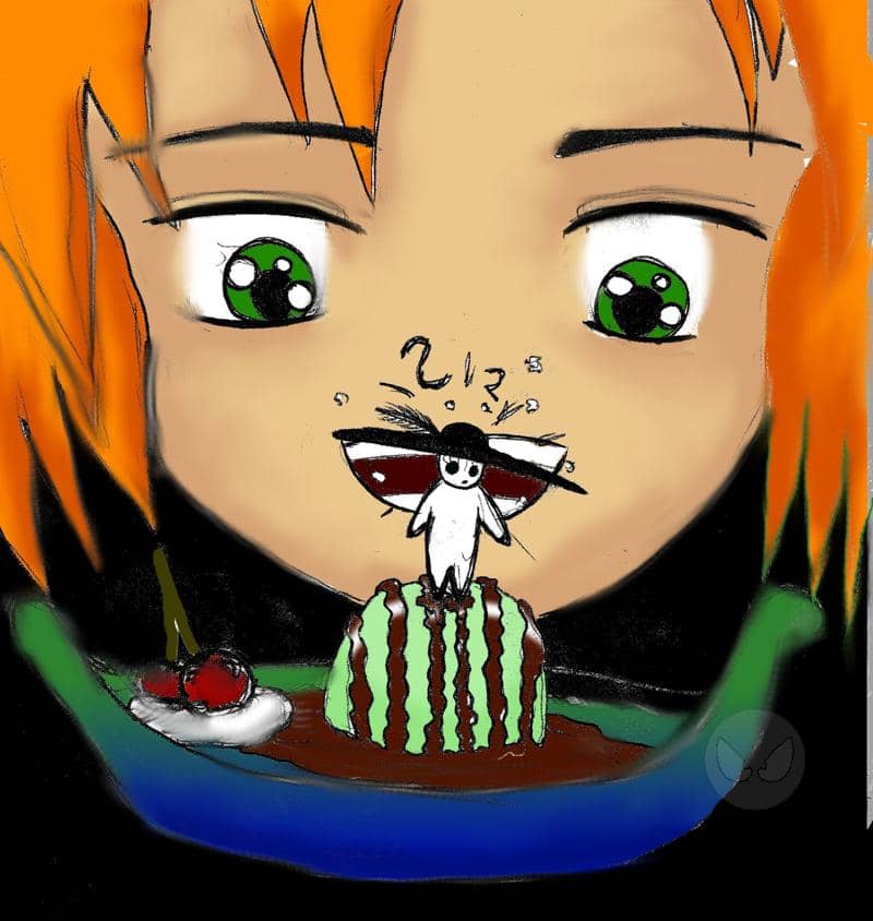 zu sehen ist ein kleines weißes keine-ahnung-was-genau-es-ist mit einem großen hut stehend auf einer kugel minzeis mit schokosoße, das in einer schiffförmigen schüssel serviert wurde. und das kind dahinter will das eis jetzt essen ^-^