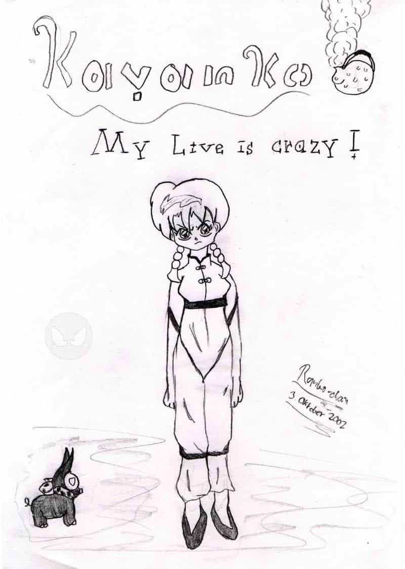 Hier ist Kayanko!!! Meine ausgedachte Figur! Ich kam dank Maguzi auf die Idee doch auch mal eine Figur zu entwerfen. Ich arbeite schon an der Fanfiction mit Kayanko. Es ist so gedacht: Kayanko ist auf einer Trainingsreise zu den Tendos gekommen und nistet sich dort nun ein. Ranma wundert sich, weil sie ihm verdammt ähnlich sieht (von der weiblichen Form). Ryoga kommt zufällig kurz darauf vorbei und fängt an Kayanko näher zu kommen. Mehr schreibe ich dazu später! Wegen Ryoga ist unten auch das P-chan. Sieht doch verknallt aus, oder? So sehr wollte ich das noch nicht, aber die Herzen in P-chans Augen waren unumgehbar. Sonst hätte ich die Situation nicht so gut darstellen können. Kayanko ist übrigens nicht immer so verbissen, wie auf diesem Bild. War ja auch mein erster/erstes Entwurf/Bild von ihr. Ich habe jetzt beschlossen auch eine Unterschrift auf meine Bilder zu machen. Ist sicherer...