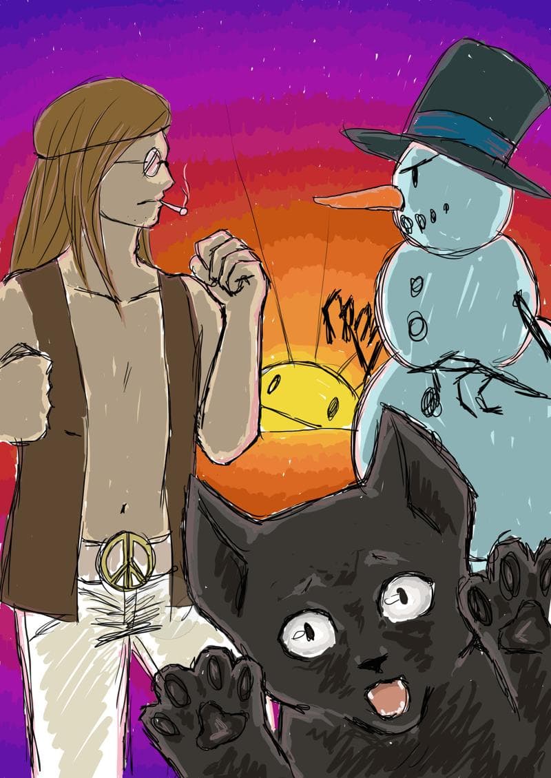 ich gebe zu dass die idee nicht ganz so genial ist wie ich es eigentlich geplant hatte, aber so schnell ist mir nichts besseres eingefallen. beim ursprungsentwurf gab es auch mehr dynamische schneemänner in kämpferischer pose, aber das war mir dann zu anstrengend und sah nach kindergarten aus. außerdem wollte ich die mitleidserregende katze im vordergrund haben.