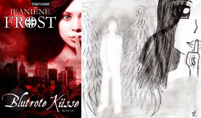 Da ist noch mal meine Zeichnung und das Cover von Blutrote Küsse.