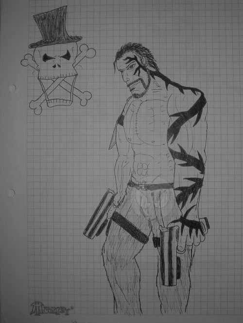 Ein früher Entwurf meines eigenen Charakters. Er selber heisst Murphy, seine beiden Pistolen Chaos & Order. Die Besonderheit sollte sein, dass er normalerweise ein Shirt trägt auf dem der Schädel mit Zylinder abgebildet ist und dieser mit ihm redet!