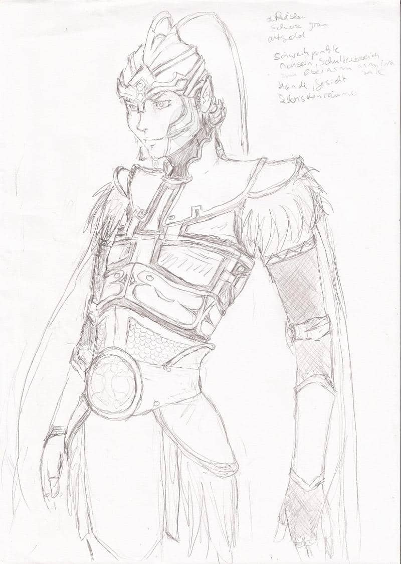 Ich habe jede Lage von Seamus Rüstung ausgearbeitet und je eine Skizze von vorn und hinten gemacht. Das hier ist das Gesammtkonzept