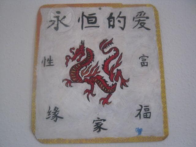 Drache in rot gehlte Japanische Schrieftzeichen herum und ornament ..ein seh altes Bild von mir,hängt jetzte bei mir in der Stube und es wirkt richtig gut.
