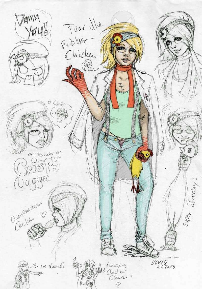 Dieses Character-Design ist eigentlich schon ein halbes Jahr alt, aber ich liebe es abgöttisch. :3 Chris ist eine Forscherin, die den ganzen Tag lang Superkräfte für neue Helden entwickeln muss. Aus Jux verpasst sie sich eines Tages Hühnerkrallen. Des Nächtens zieht sie nun los, um Unruhe zu stiften, arglose Passanten zu verwirren und ihre Flugunfähigkeit unter Beweis zu stellen.