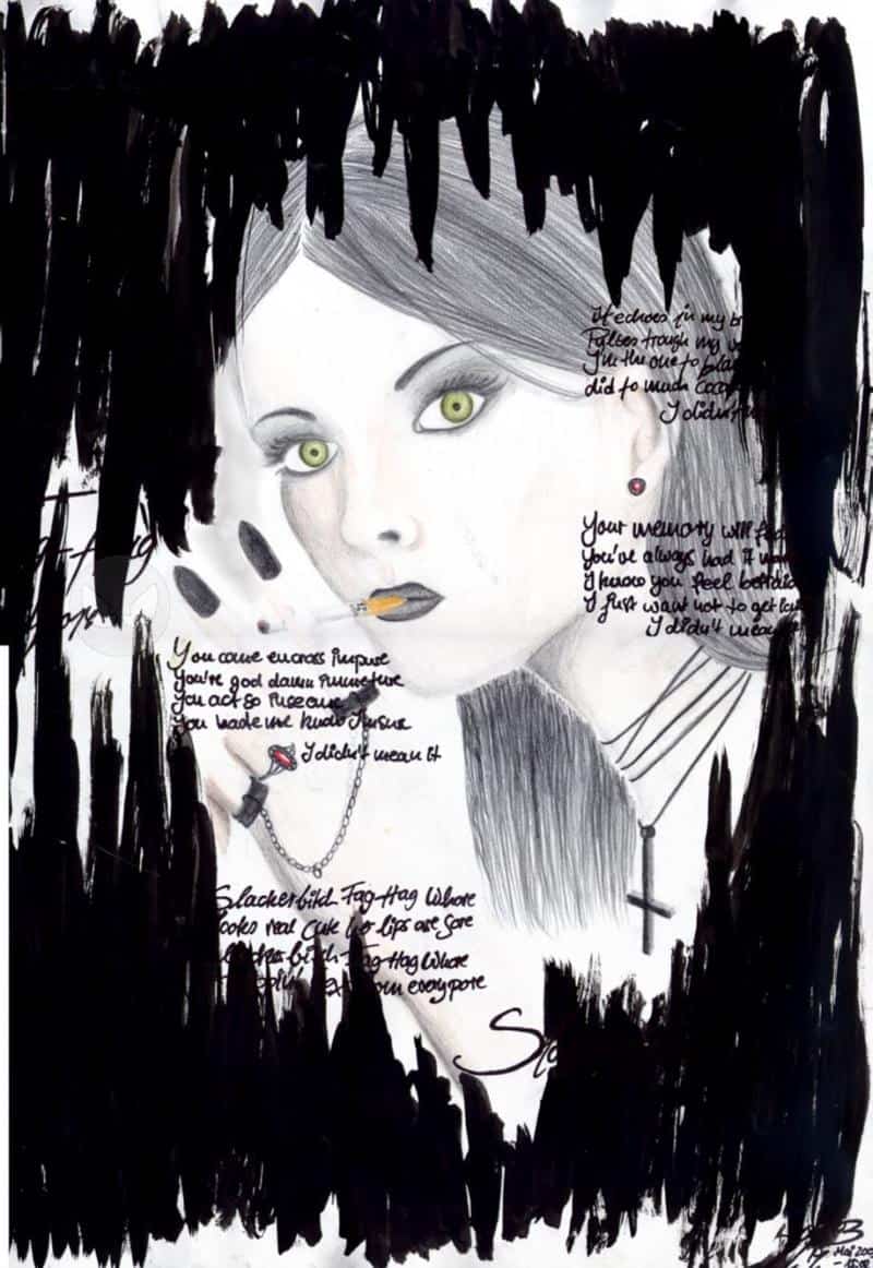 Naja, hier wär ma wieda nen Bild. Lang ists her!! Trotzdem habe ich in der Zeit seit meinem letzten Bild viel gezeichnet ohne die Bilder hochzuladen, da ich nich glaube, das sie euch gefallen. Ich habe auch zwei Bilder im Mangastil gezeichnet. Zwei... hört sich wenig an. Aber für jedes hab ich für Skizze u. Outlines über 4 Stunden gebraucht und keines der beiden coloriert... Zeitverschwendung... Möp!! Naja, das is das Erste Bild seit langen, das ich zum einen fertig gestellt hab und von dem ich zum andern glaub, das es nich so ausgefallen is... wenn ich jetz sagen würde, das Bild wär neu, würd ich lügen. Ich habs vor EWIGKEITEN angefangen, irgendwann im Mai!! Ich hat aber nie Bock, die Hand zu coloriern oder nen Hintergrund zu zeichnen oder so (Ich fang immer was an und machs nie fertsch). Jedenfalls hab ich das Bild heut wieder ausgekramt und dabei nen Lied von Placebo (welch Neuigkeit -.-"") namens "Slackerbitch" gehört und das hat mich mehr oder weniger inspiriert, das Bild weiterzuzeichnen... Eigentlich sollte es am Anfang voll das Gothic-Mädel werden, aber jetz is alles doch nen bissel hell geworden... auch Grund des Scanners! Der scannt immer so scheiße hell und wenn man dunkler stellt, wird die Quali schlechter O.o""...Mö, auf dem Original is die Hand jedenfalls net weiß und im Gesicht sin mehr Schatten! Freunde ham mir gesagt, ich hätte den Text nich mit Hand schreiben oder erst gar nich einfügen solln. nya, aber "Slackerbitch" hat mich halt dazu gebracht, weiter zu zeichnen und da gehörn die Lyrics ja au rein... ausserdem passen die zu dem Bild! höhö!! (Öh, was bedeutet "Slacker" in dem Zumsammenhang mit Bitch? Oder eher : Was bedeutet es überhaupt??) Naja, ich finde auch nich, das die Lyrics zu dem Bild passen, weil das Mädel nen Miststück oder ne Hure is, sondern weil neben "Bitch" und "Whore" auch das Wort "Fag-Hag" (Mädel, das raucht) vorkommt... passt ja... <br />