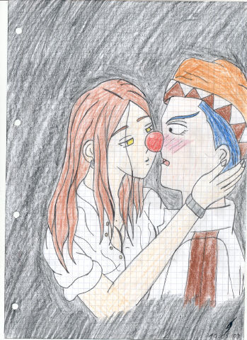 Das soll Buggy sein wo er noch zu samen mit Shanks auf einen Piraten-Schiff lebte. Das Mädchen versucht ihn einen Kuss zu geben, aber er ist nicht grade davon begeistert ^.^