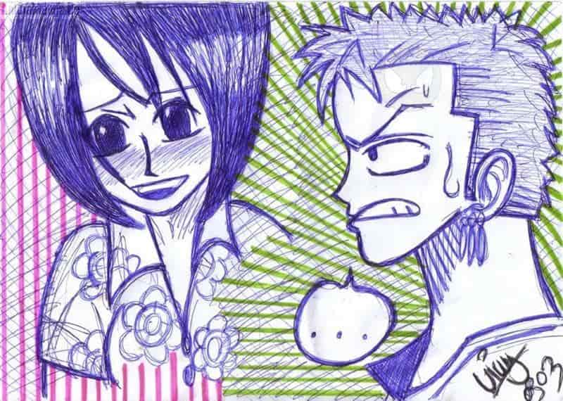 Hab ich einfach so drauflos gezeichnet. Zorro sieht komisch aus, aber Tashigi ist ganz nett geworden, finde ich.