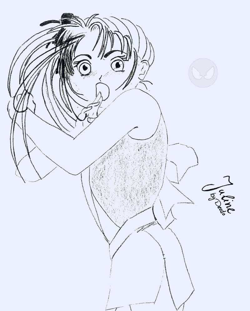 Irgendwie passt ihr Hintern nicht so ganz zum Oberkörper, kann daran liegen, das sie so eine komische Kampfposition hat, und leicht zur Seite gedraht und nach hinten gebeugt dasteht, kann aber auch bloss nicht ganz so gut gezeichnet sein!!