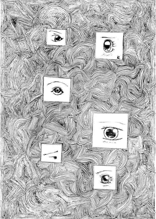 Es ist der 1. Teil von "Augen" den ich nun endlich fertig habe. Ich habe zwei Tage durchgehend daran gearbeitet, auch in der Schule. Nicht die Augen haben mir so viel Zeit gekostet, sondern der Hintergrund. Aber ich finde dadurch wirkt es erst richtig gut. Machmal bin ich müde geworden und habe rumgeschlampt und einmal ist mir aus Versehen ein paar Tropfen Wasser aufs Papier gekommen, aber ich glaube, das konnte ich ganz gut verwischen. Bitte kommentiert es! Und das benoten nicht vergessen! Danke!
