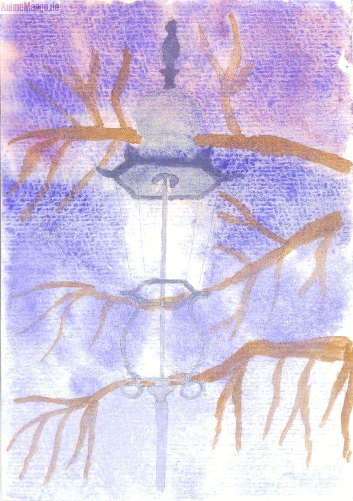 Und nun auch noch die dritte und letzte Arbeit zu meinem Kunstprojekt. Hier galt es mit den Eigenarten von nassem Aquarellpapier zu arbeiten. Die Laterne und die Äste habe ich vorher auf dem trockenen Papier coloriert, da mir das für den Ausdruck des Bildes geeigneter schien. Mir gefällt dieses Bild besser als die zwei vorherigen Varianten, da es auf mich wärmer und gefühlvoller wirkt. Aber egal... Damit ist dieses Projekt endlich abgeschlossen. Wem das Bild gefällt, der kann es mir gerne melden.