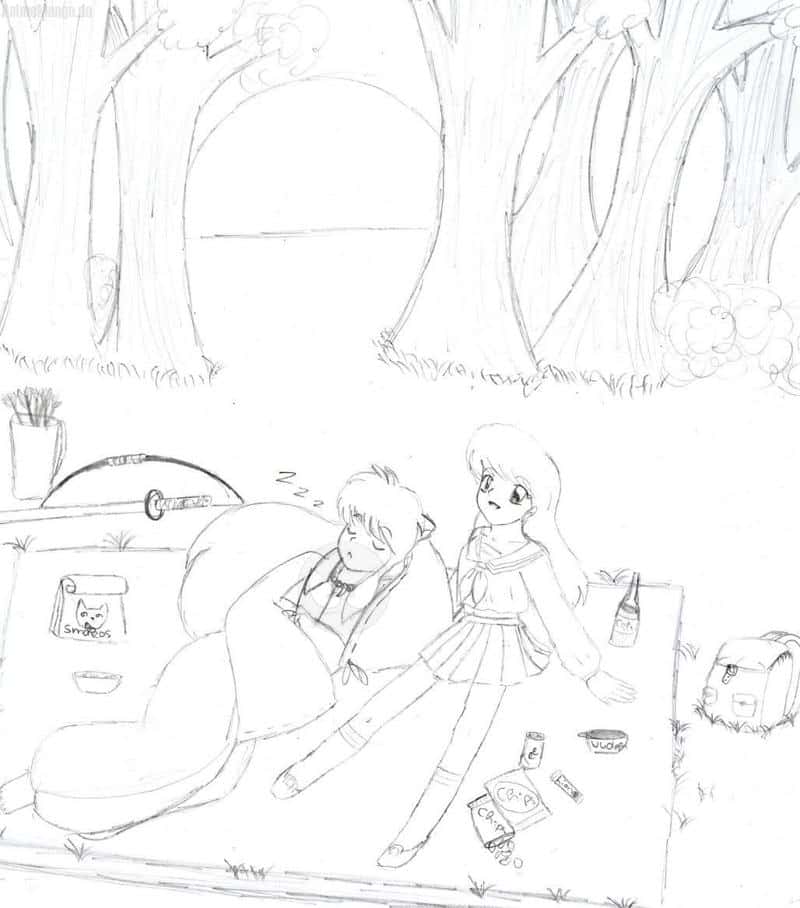 So ein Mist!!!Der scanner hat die hälfte von meinem Bild abgeschnitten.So ein Mist!!!Na egal.Inuyasha und Kagome machenein kleines Picknick.Da sie ganz allein sind,will Kagome ein bisschen plaudern.Doch Inuyasha schläft einfach ein.Würde mich über viele Kommis freuen.