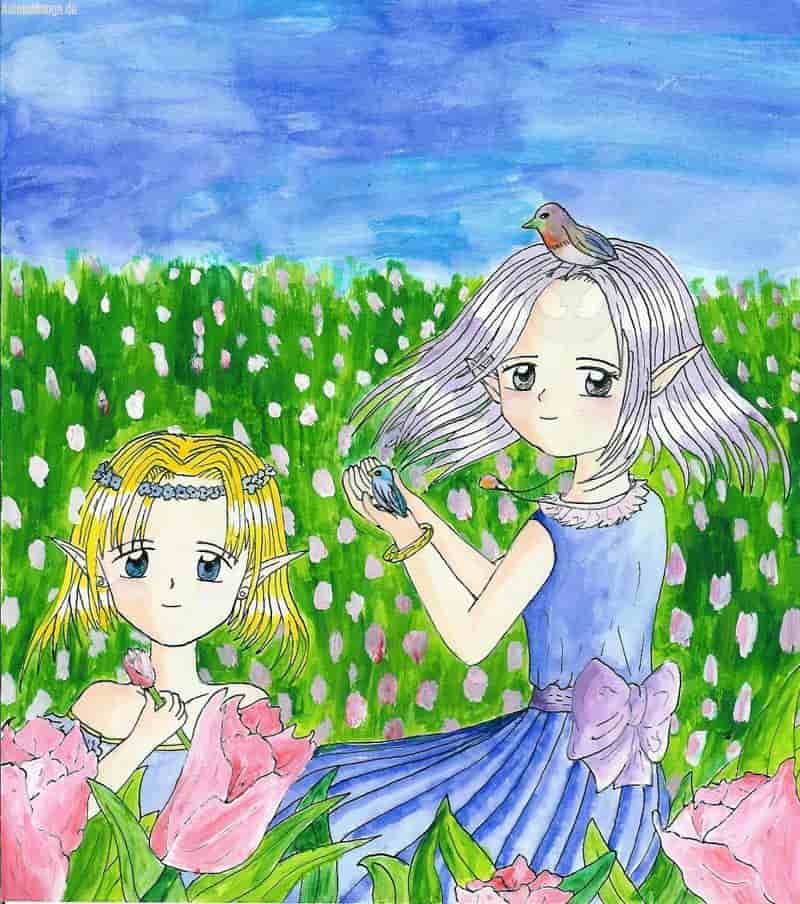 Die Idee für dieses Bild hatte ich schon ziemlich lange, leider musste ich es während des zeichnens verändern, deshalb wirkt die Linke auch so hingequetscht. Außerdem hätte ich mich nicht an Vögeln versuchen sollen, ich kann halt keine Tiere zeichnen. Leider wirkt das Tulpenfeld auch nicht als solches, was ich wirklich schade finde. Ich hatte es mir so schön vorgestellt. Die Farben sind leider wie immer nicht so kräftig wie beim Original, da ist die Schättierung viel besser. Muss wohl am Scanner liegen. Na ja, über die Hände rede ich jetzt mal lieber nicht, guckt sie euch bitte nicht zu genau an. Sonst finde ich es ganz nett, na ja, ich hab mal neue Augen ausprobiert und ich muss sagen, sie gefallen mir.
