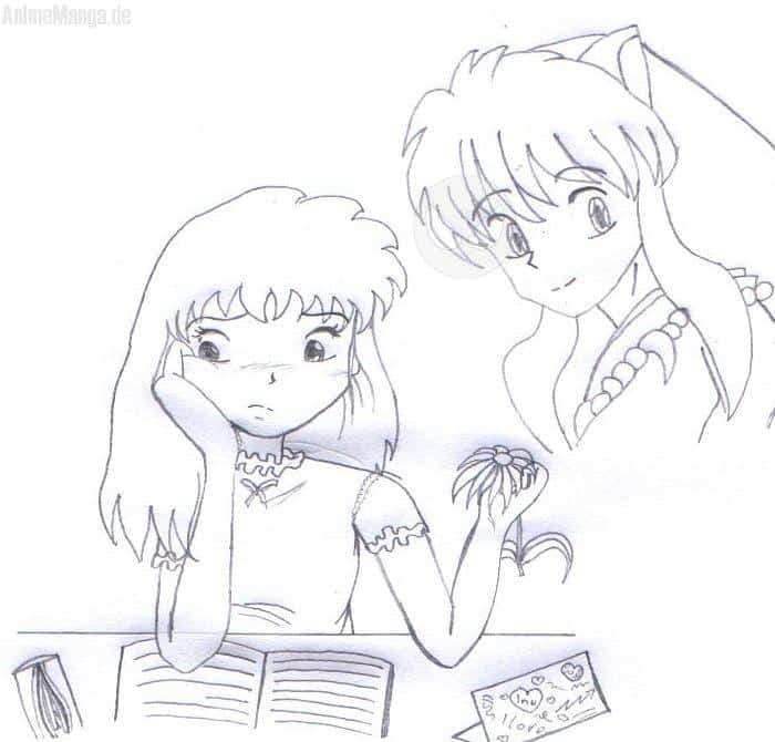 So hier ist eeendlch das 2. Bild. *Stein vom Herzen fällt* Hat echt ewig gedauert weil dieser verd...te Computer zu doof war diese seite aufzubauen , und als er es dann endlich hingekriegt hatte und ich schon Gott im Himmel dankte, hab ich gemerkt dass mein Bild irgendwie nicht gespeichert war. Also musst ich nochmal das ganze machen!!! Und jetz sieht dieses bescheuerte Bild auch noch total verwischt aus !!! GRRR!!! *TOB!* *WÜT!* *ABREAGIER!* ...... Naja was solls ist eh gelaufen. Also.. zu meinem Bild: Das soll Kagome darstellen, und eigentlich sollte sie lernen; aber ihr spukt immer Inuyasha im Kopf herum, sodass sie sich nich konzentrien kann. Dabei hab ich Inu ma lächelnd gemalt, weil man ihn sonst ja kaum lächeln sieht, und ich finde er sieht ganz nett aus, oder? Oh je jetz kommtz schon so weit dass ich meine eignen Zeichnungn schön find, ich Egoist... Ich sollt nun wirklich aufhörn zu schreibn!!! Also, das Bild is diesma Jinahn und bimo005 gewidmet... (wie ungewöhnlich!!!) Hoffe euch gefällt es, und wenn nicht, was mich nich wundern würd, schreibt mir trotzdem n' kommi &so, ja?! Biiiiiiiiiitttttttteeeeeeeee!!!!!!! Also, bis denne , *umknuddel u all* Kagomädelll ^^