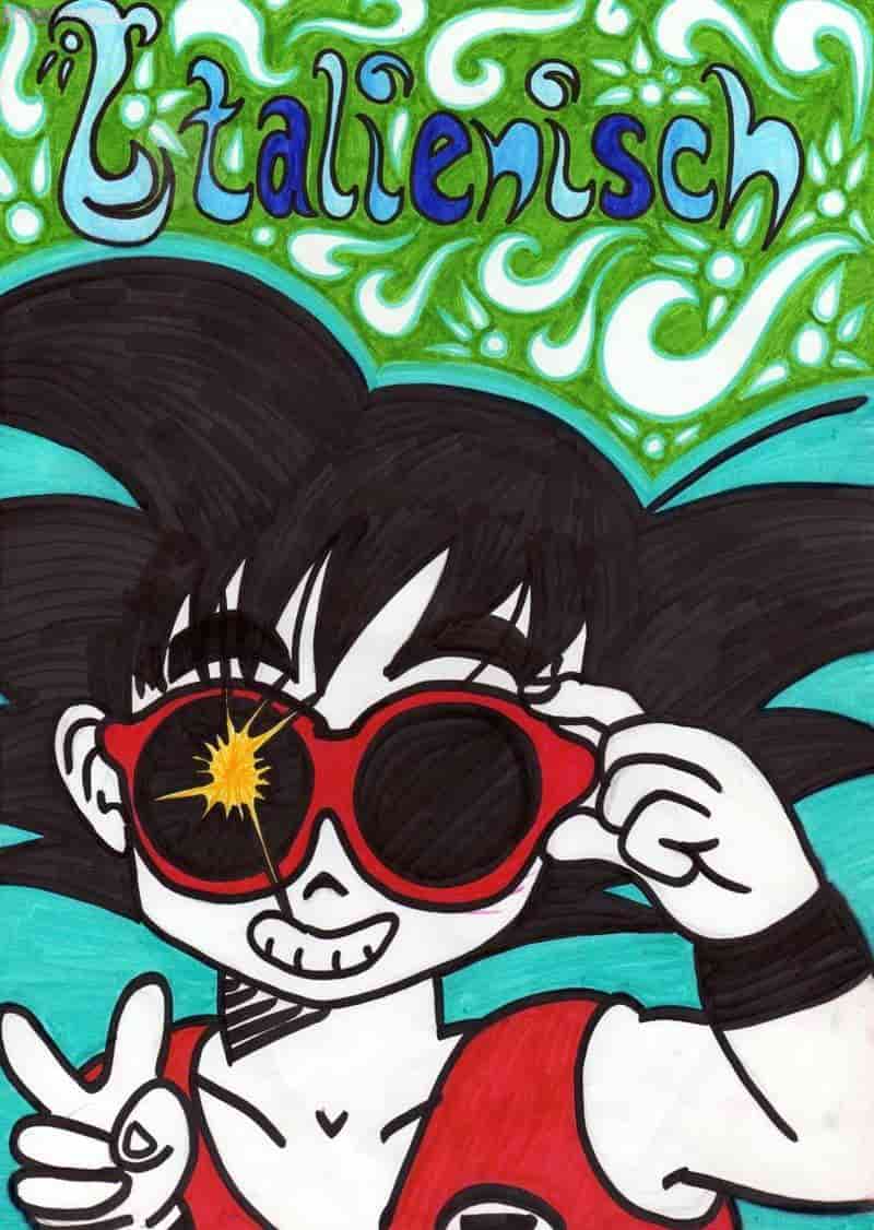 Hallo hier melde ich mich wieder mit einem Heftumschlag! diesmal hats Italienisch erwischt, ich fand der kleine Son-Goku mit Muten-Roshis Brille ist so passend! Wenns nach meinem Vater gegangen wär, würde sich in seiner Brille ne Pizza widerspiegeln und er in der Hand ein Eis halten. Aber ich hab dann gesagt: Papa, ich brauch keine Pizza und kein Eis um zu wissen dass das mein Italienischheft ist! Dann war er ruhig *lol* Ist übrigens auch wieder am Strand Playa Dorada in Lanzarote *angeb* entstanden und ich hab mich wieder mal im -kreative schriften machen- betätigt! Bitte auch ein paar Kommis hierlassen bevor ihr weiterklickt ;) Bussiehs baba Wiggieh