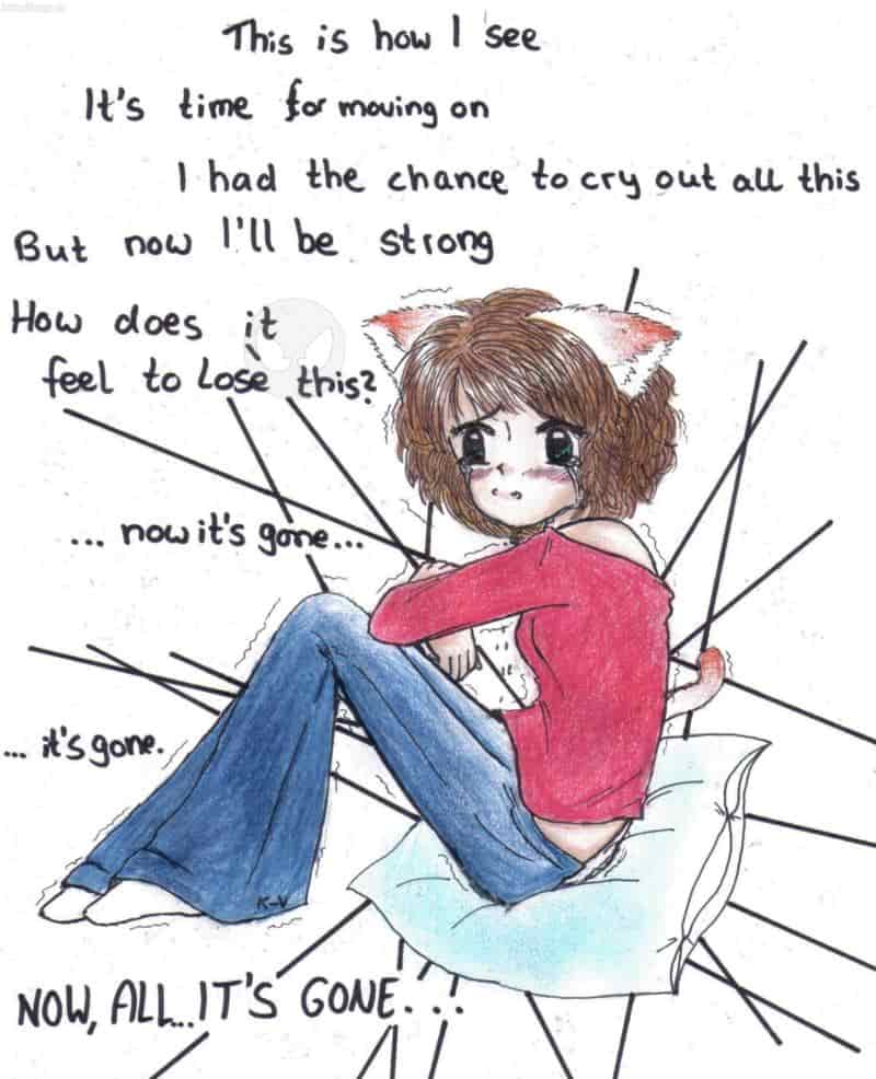 Ich hab beim zeichnen n Lied gehört, und den text etwas abgeändert... Äh, und sowas kommt dabei raus^^" KRITIK AM BILD: ich hab zu spät bemerkt dass ich den Schwanz vergessen hatte und ihn erst später hinzugefügt -_-" -- Die Oberschenkel sind zu dünn und zu lang -- Der Kopf ist zu groß -_-" -- Die Tränen hab ich auch nich richtig hingekriegt^^" WAS ICH GUT FIND: Ich mag die Haare^^ -- Die Colo hab ich diesmal ja ganz okay hingekriegt^^" Irgendwie bin ich nich so n PC-Colorer, Buntstifte und Pastellkreide liegen mir da eher. Ach das Bild ist für SACURI!!!!! *clap clap* Du zeichnest mir ja die Cherii, ne^^