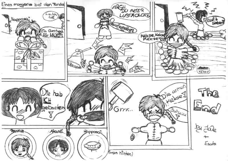 Naja, sieht nich besonders nach ranma und co aus, oder??? Sind aber unsere (esukas und meine) ersten versuche. Außerdem solln es chibis sein! Naja, was soll ich noch sagen, außer das es NICHT SO AUSSIEHT WIE ES SOLLTE (eigentlich solte es nämlich nach ranma, akane und haoopsai aussehen)