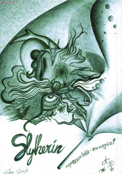 Originalgröße: A4 ___ Dauer: Ungefähr 8 Stunden ___ Zeichenstil: Blauer Kugelschreiber + mit „Adobe Photoshop 7.0“ die „Farbbalance“ verändert ___ Hier eine kurze Erzählung zum Bild, die mir spontan eingefallen ist -genau wie die °Muster° darauf: ___ Snape richtet seinen Zauberstab auf ein Blatt Papier, dass er zuvor mit einem Zauberspruch schweben lassen hat, wedelt ihn ein wenig und spricht betonend die Worte: “Repraesentatio – ars magica!“ Aus dem Zauberstab leuchten hellgrüne Funken auf. Vor dem Blatt Papier bildet sich etwas Nebel, dann sieht man ein kunstvolles Gemälde darauf. Rasch dreht sich der Professor um, blickt in die Klasse und sagt: „Nun versucht ihr es.“ Vor den Schülern schweben Blätter. Wieder kann Seamus den Spruch nicht richtig aussprechen und verbrennt somit das Papier. Nur wenige schaffen es überhaupt irgendwas auf das Blatt zu bringen, falls es nicht schon vorher vom schlechten Ausspruch zerstört wird. „Lasst sehen, welches Bildnis in eurem Talent steckt“ ruft Snape und geht durch die Reihe, wobei er sich die Blätter jedes Mal mit einem kleinen Schwung mit dem Zauberstab in seine Richtung drehen lässt. Überrascht bleibt er stehen, vor einer Schülerin von der er so etwas Großartiges nicht erwartet hat.. ;b ___ Schmalzig, nicht? ];D> hehäee ___ ^°;’^_/*´