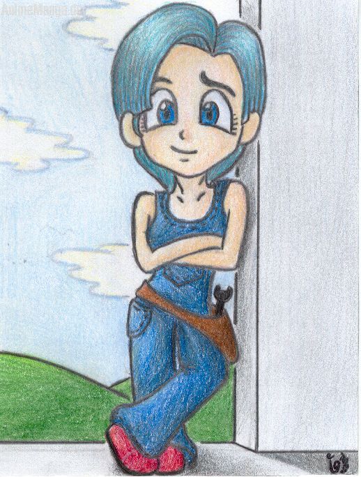 Nothing special, really. Hab' ein bisschen rumgekritzelt, und irgendwie ist dann das hier entstanden. Was blieb mir denn anderes übrig, als es auch noch zu colorieren? *lol* Hmm ja, der Hintergrund... ich wollte eigentlich gar keinen, aber noch während ich mir das gedacht habe, hat meine Hand schon angefangen Wolken zu malen. Böse Hand! Böse böse Hand! ^_^' Ich hatte echt Schiss wegen der Haare - ich meine, ich LIEBE Bulmas Haare, und sie dann irgendwie zu verschandeln... *unsicher auf Unterlippe beiß*
