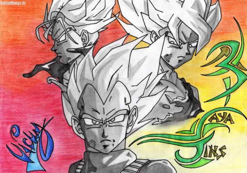 HAllöchen meine Lieben!!! Ich bin wieder zurück! Also DA war ich ja schon die ganze Zeit, aber ich habe es wieder geschafft etwas sinnvolles zu Papier zu bringen, etwas auf das ich stolz bin, etwas das mir gefällt und etwas, das mich doch ziemlich viel Zeit gekostet hat : TADAAAA!!! Ich liebe Vegeta ^^° Und Trunks und Goku auch und dieses Bild überhaupt *lol* Deswegen musste ich es abzeichnen (ja, leider nur abgezeichnet -.- aber dafür von wutziklein auf A4, hehe) Also der HG ist mit Buntstiften, die SJs mit Bleistift, die Tribals im Hintergrund sind aus einem Tatoo-Motiv-Heft genommen und abgeändert (ich hab wahllos irgendein Tribal gemacht und bin dann draufgekommen, dass es aus den Buchstaben S,J besteht *glotz* das war so genial, dass ich es gleich umsetzen musste. Das andere mit dem 3er ist auch abgeändet worden von mir.) Ich hoffe es gefällt euch und ich bekomm schön viele Kommis und so ;D VEGETA 4 EVER!!! Ich widme dieses Pic allen, die meinen gerade in einem künstlerischen Tief zu stecken und nur qualitativ minderwertige Bilder fabrizieren (so wie ich in letzter Zeit *pfeif*), es kommt wieder ein HOCH *freu* dann natürlich meinem lieben Darky, weil ein schönder Vegeta drauf ist und auch DMW, du magst ihn ja auch, leider ist er da nicht MajinVegeta -.- Dann meiner Alltime Fanmeute Mokona, Gorowynn und Mizzbabyz... und allen DBZ Fans! HAb euch lieb! Bis bald, ich hoffe es kommen mehr so gute Bilder! Euer Habbieh Wiggieh