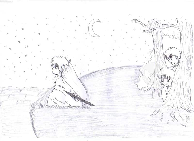 Naja, es zeigt jedenfalls das Inulein, wie er verträumt in den Sternenhimmel guckt und Sango und Miroku ihn dabei amüsiert beobachten. Die spionieren ihm ja immer hinterher... ^-^ *ggg*