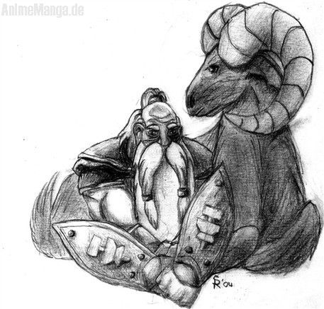 Das ist ein Zwerg mit einem Steinbock den er zum Reiten verwendet.
