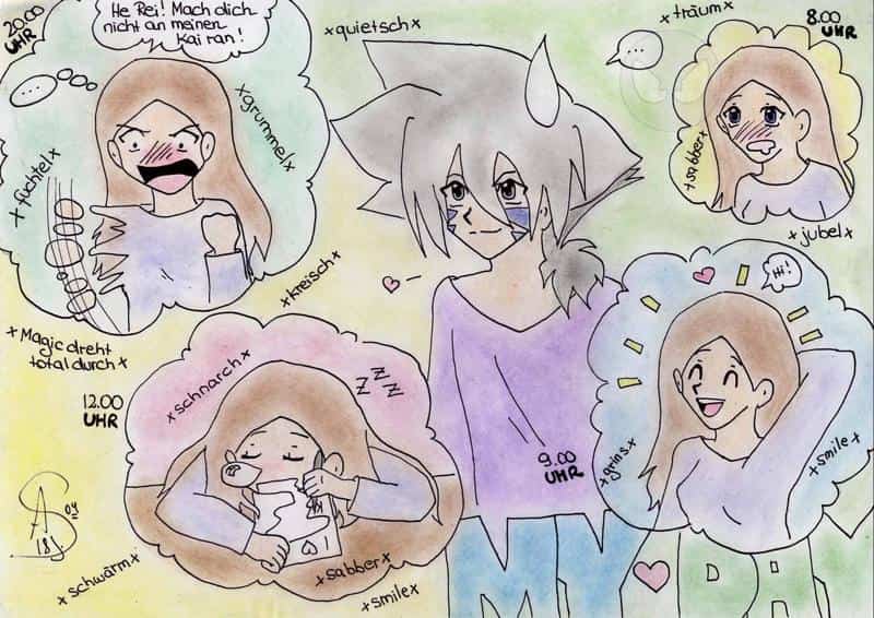 Ich lieeeeeebe Bilder wo ich und Kai drauf sind!!!! Und dieses beschreibt meinen Tag!!! Also: Ich sitze um 8 Uhr am Frühstückstisch und sabbere... aber nicht wegen dem leckeren essen, sondern weil ich an meine schatz denke. 1 Stunde später treffe ich ihn dann und begrüße ihn etwas verlegen. Dann, um 12 Uhr bei Mittagessen schlaf ich über einem Liebesbrief ein, weil ich die ganze Nacht auf war, weil ich mich für kein Outfit entscheiden konnte... Um 20 Uhr verteidige ich dann noch meinen Kai tapfer gegen Rei, der sich schonwieder an Kai ranmacht... (obwohl ich zugeben muss, dass ich das Paaring KaixRei einfach super finde... *schwärm*... ups... ich wiedersprech mir selber... sorry...)