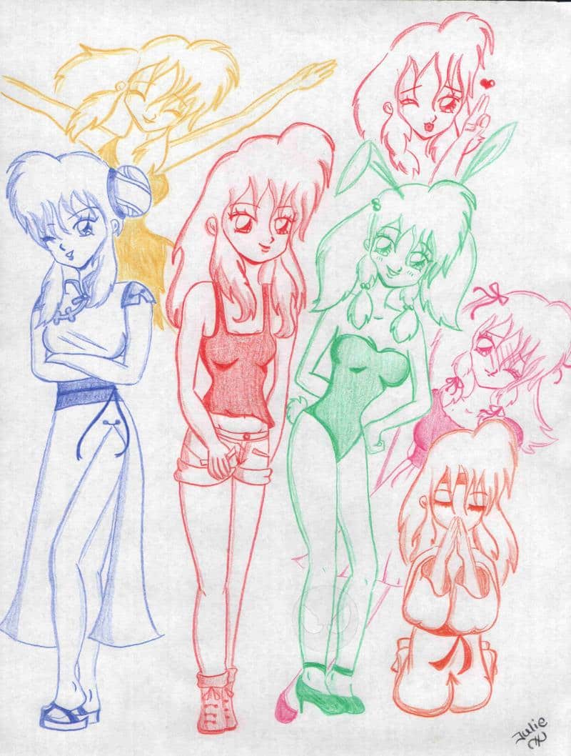 ....so mal ein sehr farbenfrohes pic! was soll ich dazu sagen? also..ich hab alles mit buntstiften gezeichnet... deswegen konnt ich halt nischt radieren, ne?? naja..ich mags trotzdem..ihr seht meine julieee in verschiedenen outfits mit verschiedenen frisuren...mir persönlich gefällt der kimono am besten! ^^