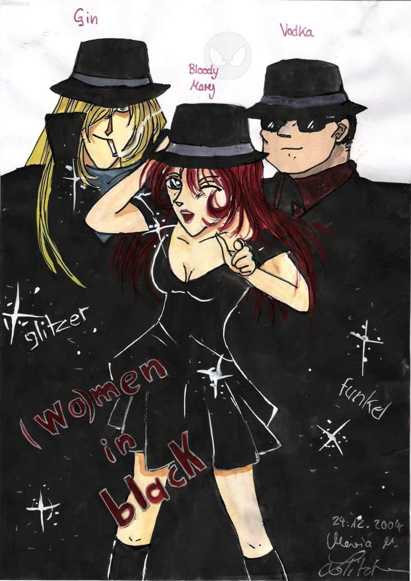 Hallooooo!!!^^ Hoffe es gefällt dir mein Schatzimausi! Sehen die Männer in Schwarz nicht gleich sympatischer aus, wenn sie lächeln? Für Nichteingeweihte: Gin und Wodka kennen die meisten Conan-fans ja, und das Weib in der Mitte, das sich so schön breit macht, bin ich, Bloody Mary(Wodkas Sargnagel) ^^... ( Durch die Körperstellung sieht es so aus, als hätte ich keinen Hals, bitte keinerlei Beachtung schenken, OK?!) CIAO EURE MARY
