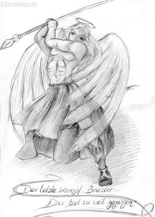 Okay...jetzt ises doch soweit gekommen...das ist erzengel michael, der gerade seinen bruder luzifer ersticht XD auch wenn man den ned sehen kann....