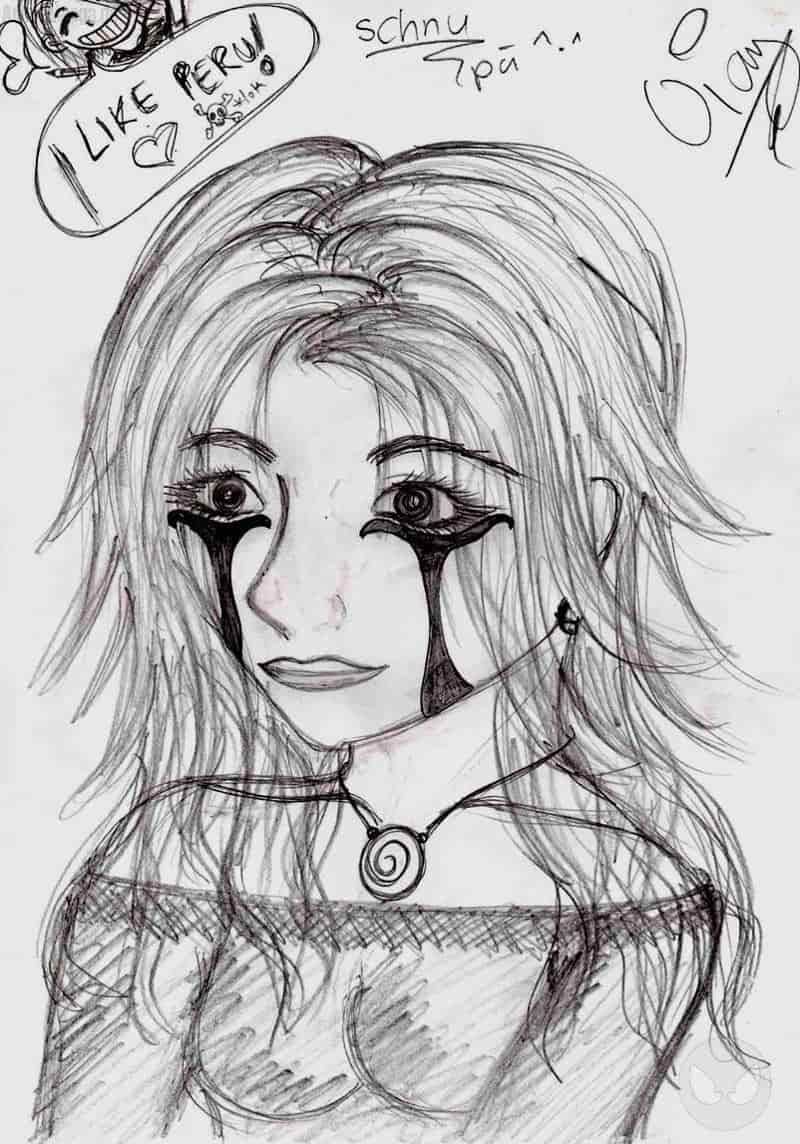 Ein bescheidenes Lebenszeichen von mir ^-^ Also ich hab das In den Weihnachtsferien vorm Fernseher gezeichnet, einfach so. Den Tipp zur Frisur hab ich vom Freund meiner Mutter bekommen und meine Tante meint, dass die mir ähnlich sieht O_o find ich nicht, aber bitte XD Also diese .. Streifen da im Gesicht sind eigentlich keine Tränen sondern so ne Art Schminke ^^ ich hab mich da von Peruh aus One Piece inspirieren lassen ^^ der Typ ist cool, ich kanns gar nicht oft genug sagen ^^ So,also ich wünsche mir Kommiehs, obwohl ich selber weiß dass das keine starke Leistung ist, dieses Bild >_< Bussiehs baba, Wiggiehlein
