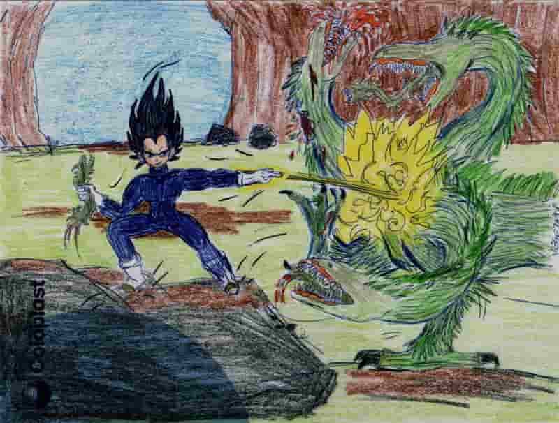 ...naja....meine Schwester hat das aus meinen Papiereimer rausgezogen....ich wollte es eigentlich nie jemals irgendwo zeigen...das habe ich mit Kugelschreiber während einer Betriebsfortbildung skizziert...und da lagen nur vereinzelt ein zwei Holzbuntstifte und ein paar Pastellkreidestifte rum....aufgrund der Grundskizzierung mit Kugelschreiber erkennt man die einzelnen Berichtigungn und Fehler z.B. am Kinn, die Arme und Beine....rechts der zu späte anskizzierte Kampfstiefel...alles was man halt mit Bleistift wieder wegradieren kann...naja...auch solche Pics haben manchmal eine gewisse Ausstrahlung...obwohl ich noch immer finde, das nichts für hier ist....Vegeta gegen Drei-köpfiges-was auch immer-Biest....