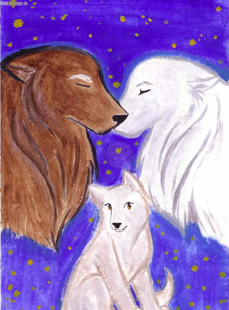 Loki ist erst Skadis Beta-Wolf, doch dann wird er ihr gefährte, und die beiden bekommen eine kleine Tochter, das ist der beige Wolfi da unten^^ Sie heißt Filia. Das ist Latein und bedeutet "Tochter"^^°