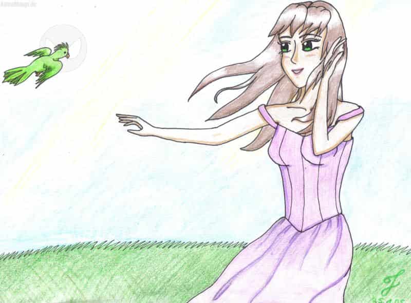 Ich bin mit dem Bild eigentlich recht zufrieden. Ist das erste mal, dass ich eine Person schräg gezeichnet hab. Das gesicht von ihr find ich auch nicht schlecht, hab mal ein bischen rumprobiert und das kam bei raus. Sieht anders aus, als meine Bisherigen gesichter, finde zumindest ich. Bei dem Rock bin ich beinahe verzweifelt, mit diesen elenden Falten, aber bis auf die eine, denke ich, sind sie ganz gut geworden. Ich muss zu meiner Verteidigung sagen, dass das Bild in Natur nicht so blass aussieht. Der Verdammte Scanner hat mir die Farben total zerissen!!! Ich hab auch versucht die Farben zu verstärken, aber ohne Erfolg. Im Hintergrund sollte man eigentlich einen Hellblauen Himmel sehen, der Von Wolken und Lichtstrahlen durchzogen ist, aber das kommt hier nicht zur geltung.... Grummel